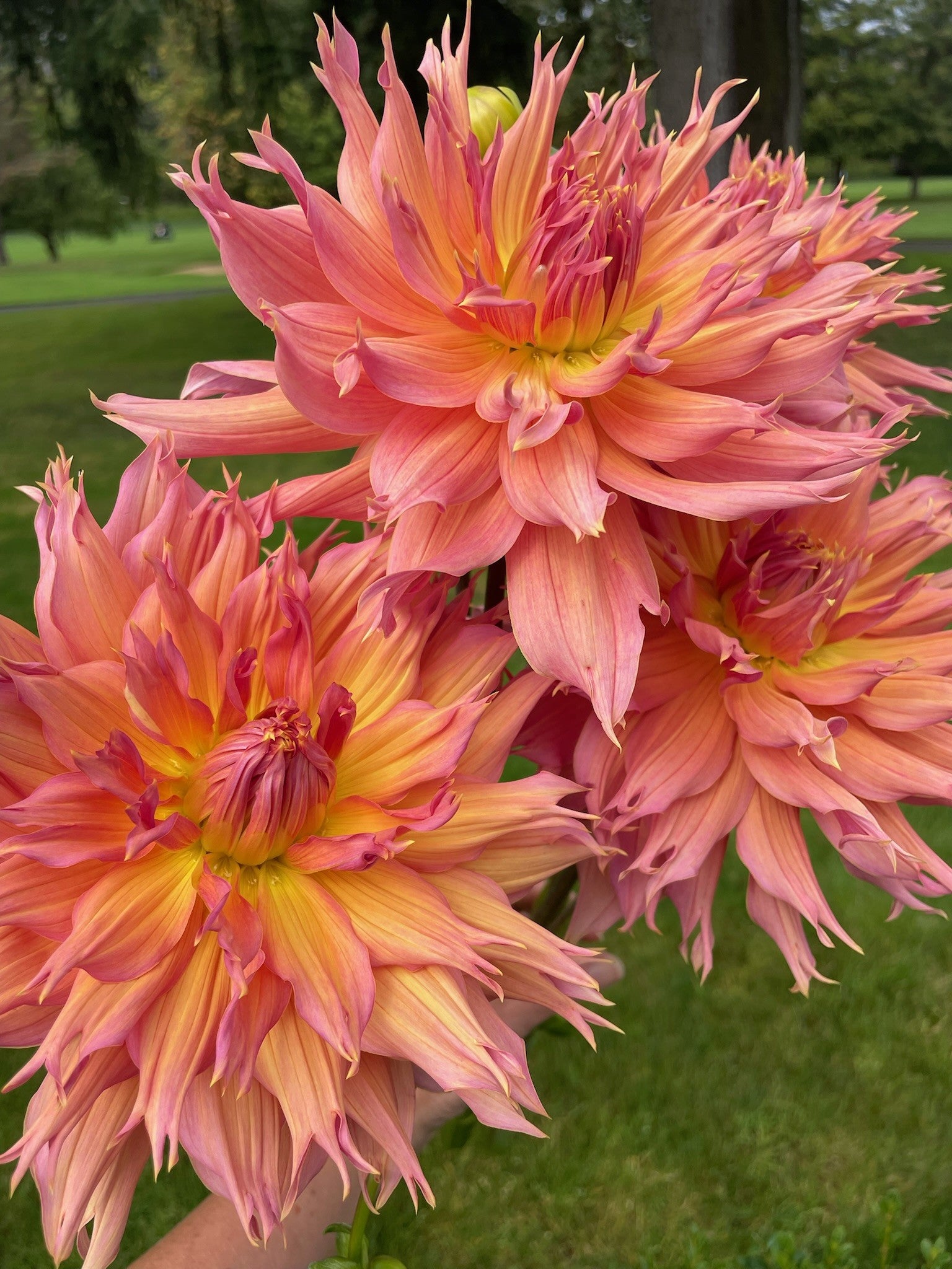 The ‘Omega’ dahlia is a large flowering, laciniated dahlia with blended colors of peach, rose, apricot, and yellow.