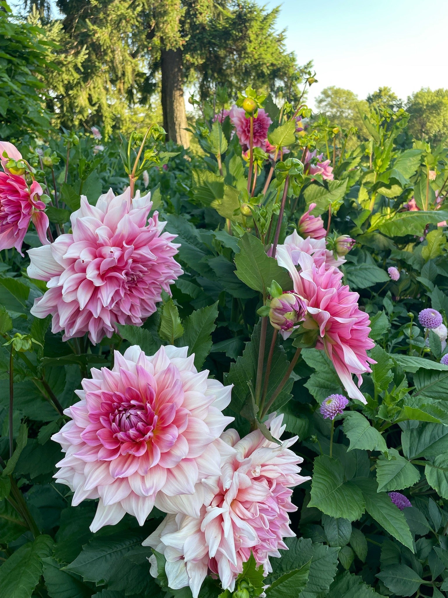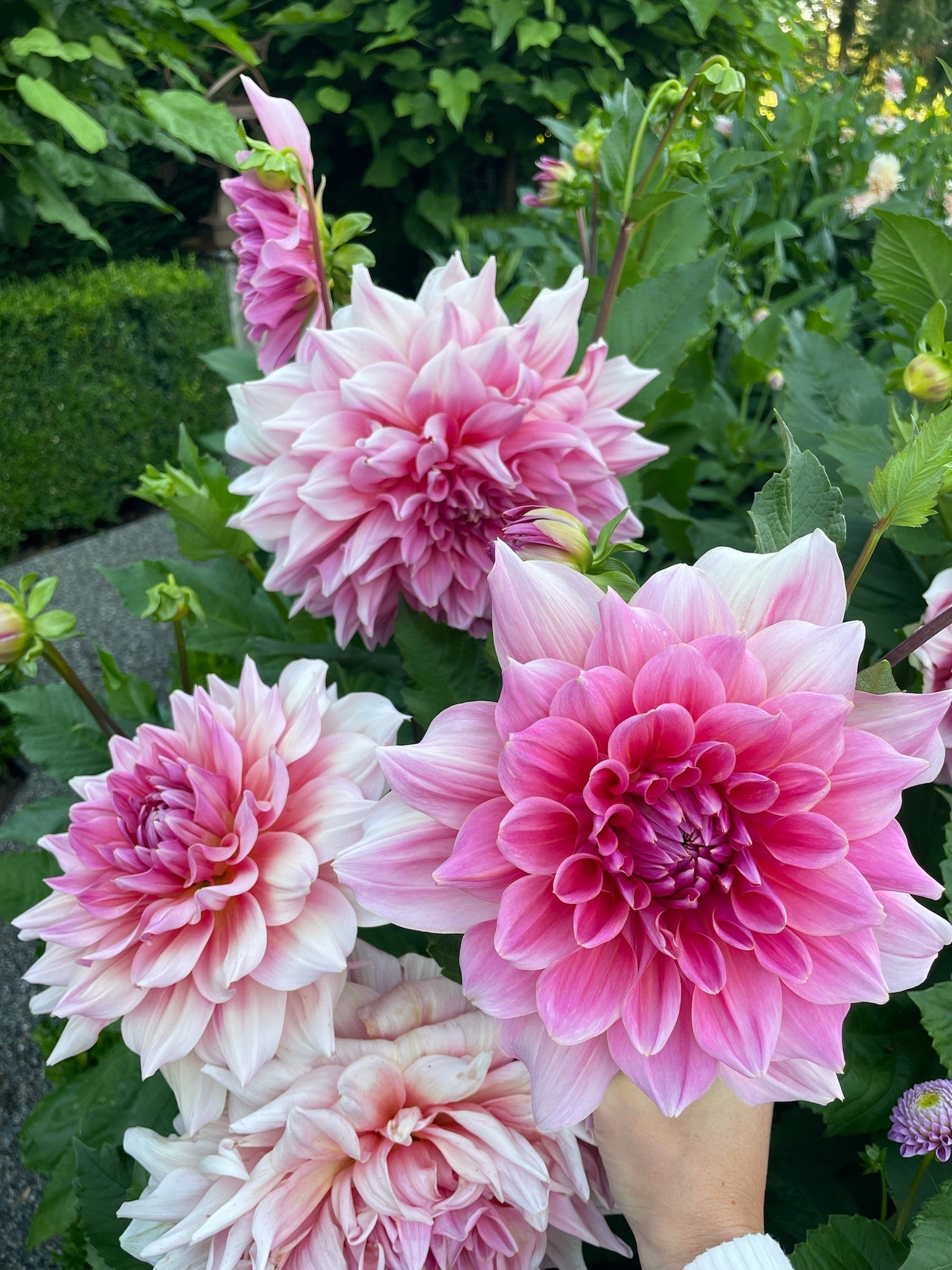 ‘Otto's Thrill’ is a decorative dahlia known for its large, dinnerplate-sized, fully double pink flowers that have a rose-pink to salmon hue, often fading to creamy white at the tips.