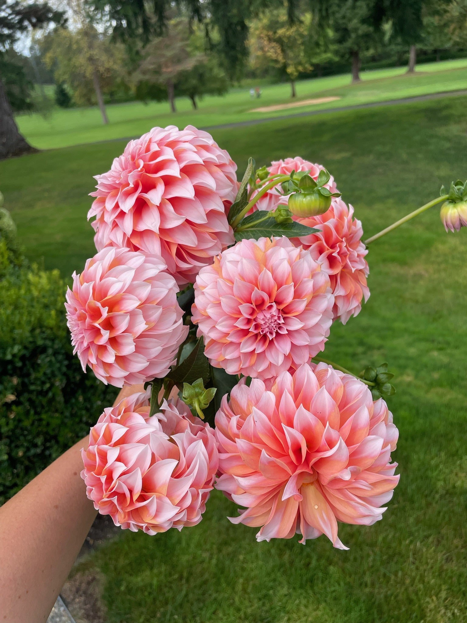 The ‘Peaches and Cream’ dahlia has soft salmon petals that fade to white at the tips. The blooms often have a graceful, formal shape with petals that curl back.